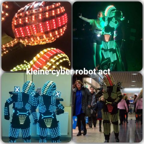 De Cyber Led Robots op stelten zorgen voor een vrolijke ontvangst act bij de entree en kunnen ingezet worden als een meet and Greet act. Op deze pak zitten volop led verlichtingen en de robots dragen een laserhandschoen. Als duo zijn zij perfect in te zetten bij al uw promotieactiviteiten, feesten, beurzen, festivals en andere feesten. De lengte van deze act is 1 x 45 of 2 x 30 minuten binnen 2 uur. De hoogte is rond 3 meter van de cyber. Nu ook iets kleiner cyber op stelten 2.20 hoog.
